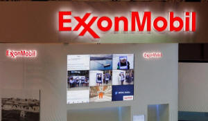 Logos of ExxonMobil are seen in its booth at Gastech, the world's