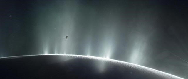 NASA's Cassini spacecraft is shown diving through the plume of
