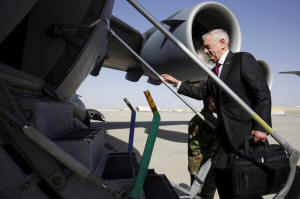 U.S. Defense Secretary James Mattis boards a U.S. Air Force C-17 for