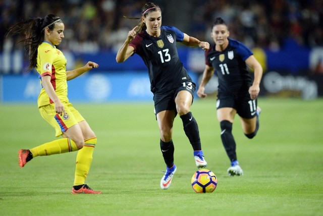 USA forward Alex Morgan (13) moves the ball against Romania defender