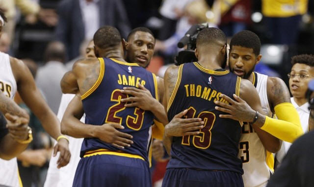 Paul George (13) hugs Cavaliers center Tristan Thompson (13) in game