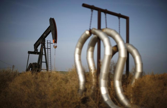 A pump jack and pipes are seen on an oil field near Bakersfield on a