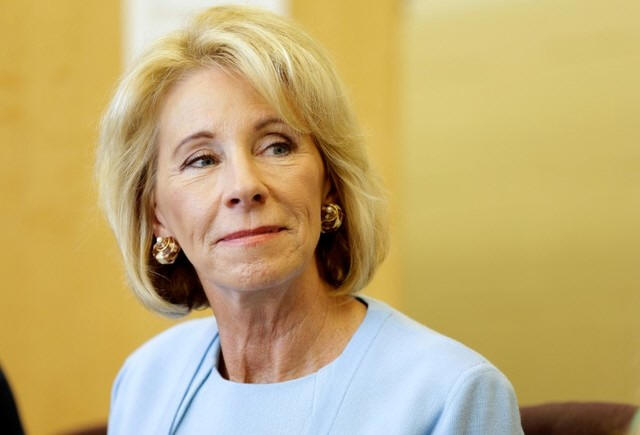 U.S. Secretary of Education Betsy DeVos listens to a presentation