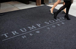 Women walk across a carpet outside of the Trump Soho Hotel in New