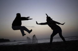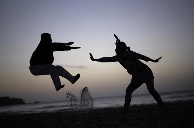 A couple acts out a martial-arts move for a friend's camera (not