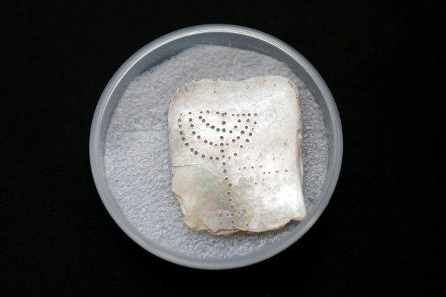 mother-of-pearl tablet engraved with a symbol of the Jewish menorah,
