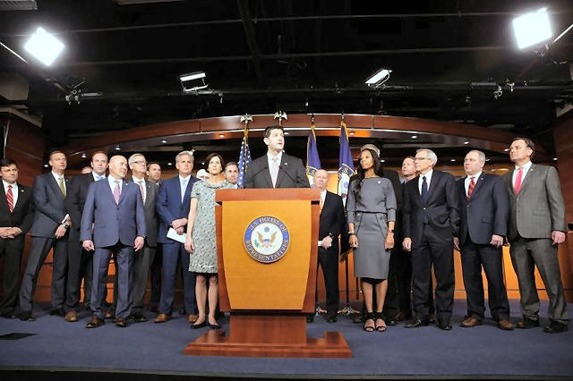 with House Republicans during a press briefing on Capitol Hill in