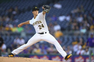 Pirates starting pitcher Tyler Glasnow (24) delivers a pitch against