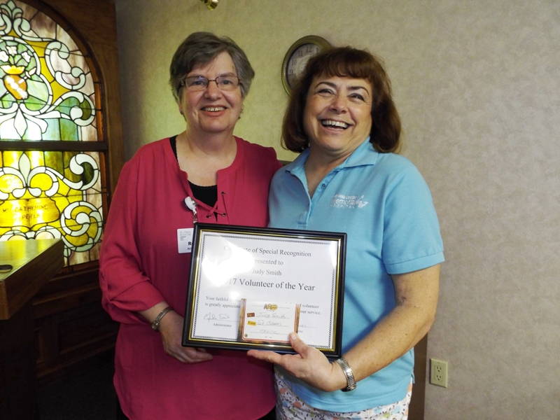 [April 27, 2017]   LINCOLN - On Tuesday, Judy Smith was named the Volunteer of the Year at the annual Volunteer Appreciation Luncheon at St. Clara’s Manor. Smith was presented a plaque and other gifts by St. Clara’s Activity Director Rebecca Johnson.