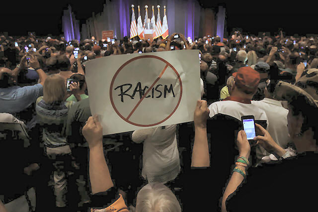 A protester holds up a an anti-racism sign as Republican