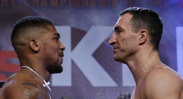 Klitschko, 41, signaled a V for victory sign as the pair faced