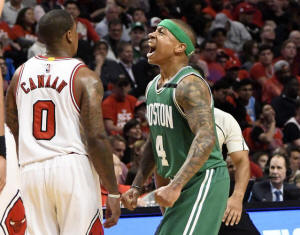 Celtics guard Isaiah Thomas (4) celebrates a basket as goes by
