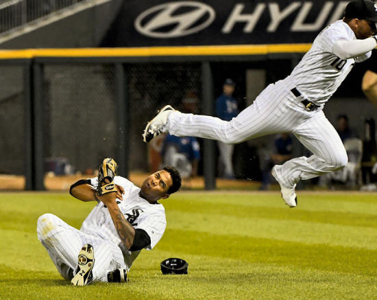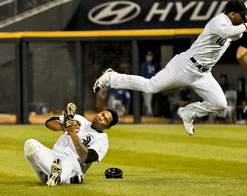 Sox second baseman Yoan Moncada (10) collides with right