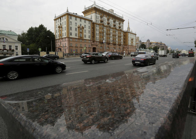 Cars drive past the U.S. embassy building in Moscow, Russia, July