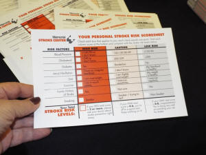 The Stroke Center was also handing out a personal risk score card to help folks visualize the issues that put them at higher risk for stroke. In the high risk category: if blood pressure normally exceeds 140/90, if total cholesterol is greater than 240, if one is diabetic, has an irregular heartbeat, and overweight, there is a danger of stoke in the future. Lack of exercise, smoking, and family history play a large part in the risk as well.