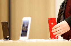 A person holds a red iPhone product at a Apple store in Nanjing,