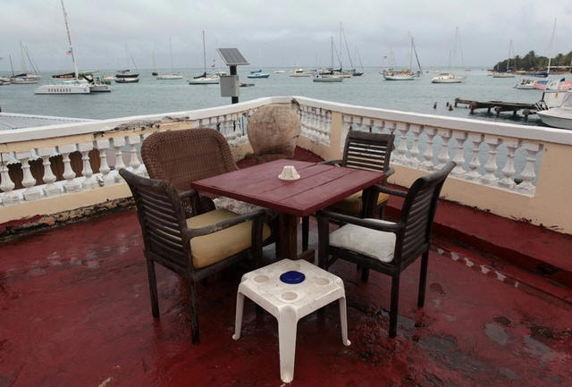 A table and chairs are seen on a terrace of a hotel in Christiansted,