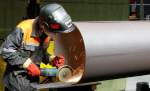 A man is seen at work at Zagorsk Pipe Plant (ZTZ), which launched