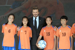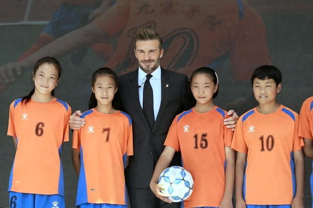 David Beckham (C), former captain of England's soccer team, poses as