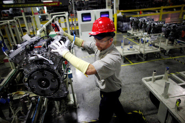 employee moves an engine at the Toyota engine assembly line in