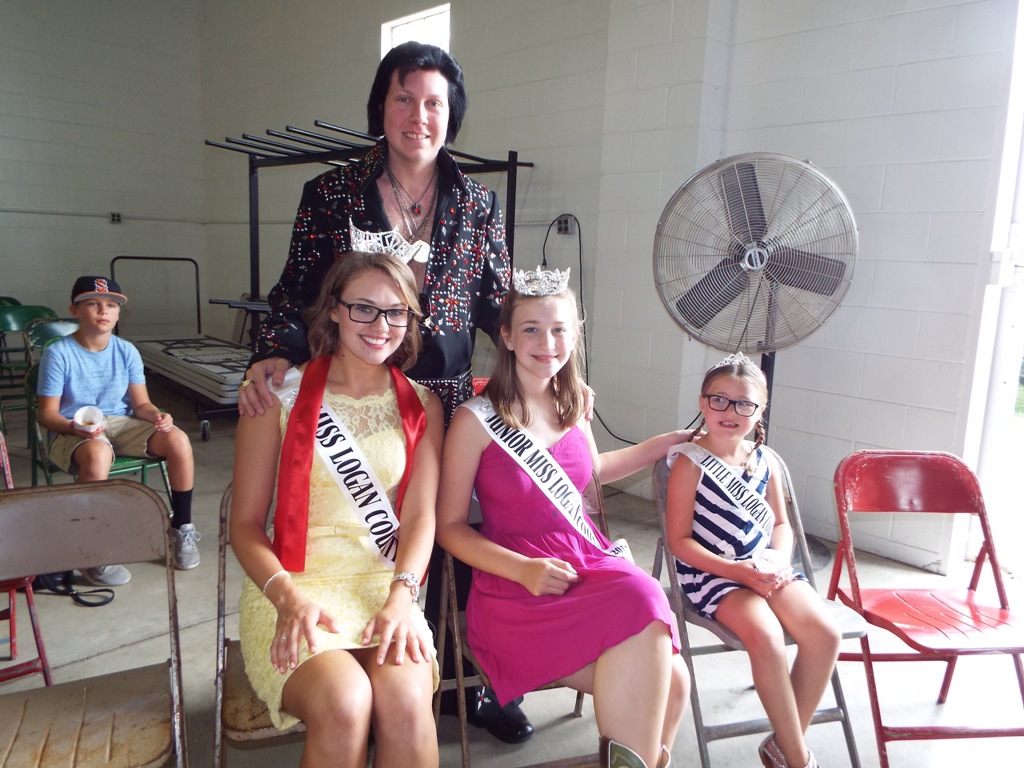 During the judging interlude, as Elvis he went over to the seated Logan County Fair Queen Meg Meeker and executed a King-like action gifting his performance sash.