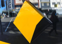 Pedestrians are reflected in a Commonwealth Bank of Australia logo
