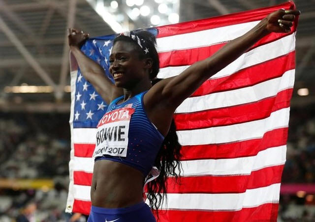 Tori Bowie of the U.S celebrates. REUTERS/Lucy Nicholson