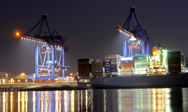 A containership is loaded at a terminal at the harbour in Hamburg,
