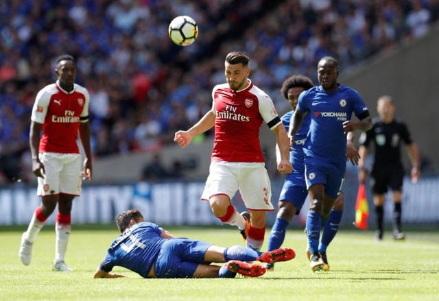 Arsenal's Sead Kolasinac in action with Chelsea's Cesc Fabregas
