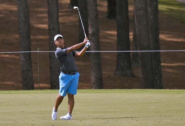 Si Woo Kim plays from the fifth fairway during a practice round for