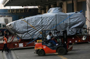waits to be loaded onto a truck at a cargo terminal in Hong Kong,