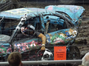 The heat featured only three vehicles, and for a while contestant number three was doubtful, until he came roaring into the field….in reverse! It turned out that the orange Drake-Scruggs car had no steering control. He endured the entire heat and made more than a few hearty strikes on his opponents.