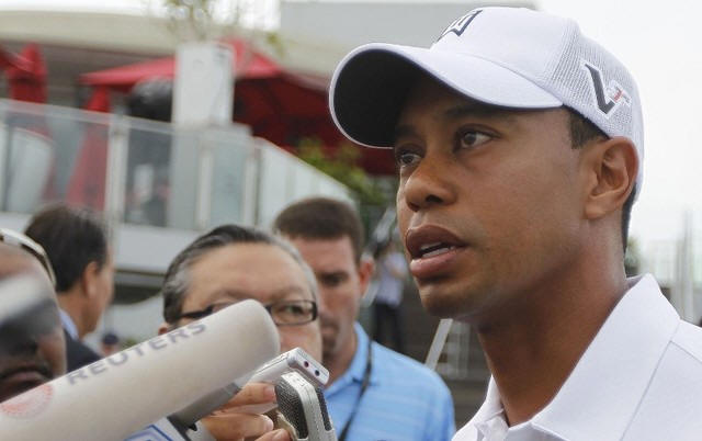 USA's Tiger Woods talks to the media during a question and answer