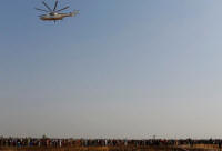 World Food Programme (UN WFP) helicopter flies over a queue