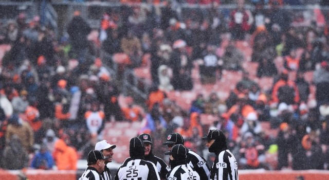 Officials gather as the snow falls during the second quarter