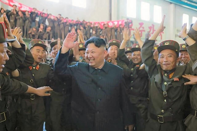 North Korean leader Kim Jong Un reacts with scientists and