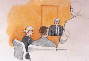 A sketch of Taylor Swift (L) and her attorneys in Denver Federal