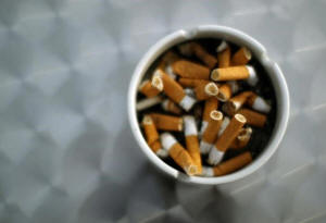 An ash tray with cigarette butts is pictured in Hinzenbach, in the
