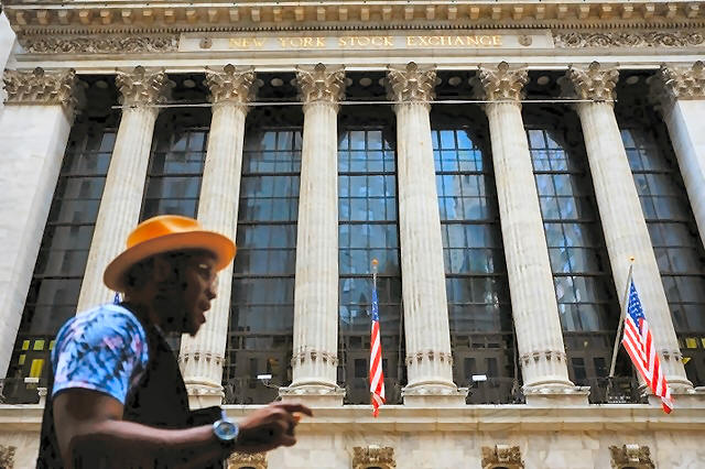 A man walks by New York Stock Exchange in the financial district in