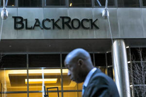 A man walks next to a BlackRock sign pictured in the Manhattan