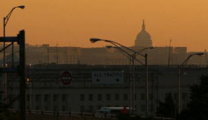 The dome of the U.S. Capitol rises over the Pentagon and other