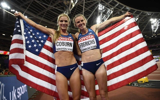 Emma Coburn and Courtney Frerichs of the U.S. celebrate wining the