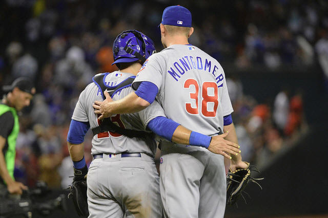 Cubs relief pitcher Mike Montgomery (38) and catcher Alex Avila (13)