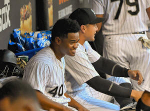 White Sox starting pitcher Reynaldo Lopez (40) laughs in the dugout