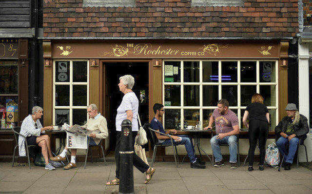 People sit outside a coffee shop in Rochester, Britain, August 8,