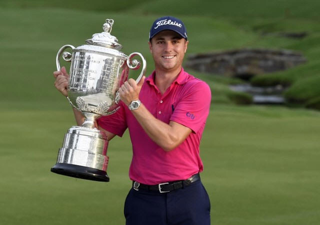 Justin Thomas celebrates with the Wanamaker Trophy after winning the