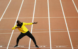 Usain Bolt of Jamaica poses during a lap of honour. REUTERS/John