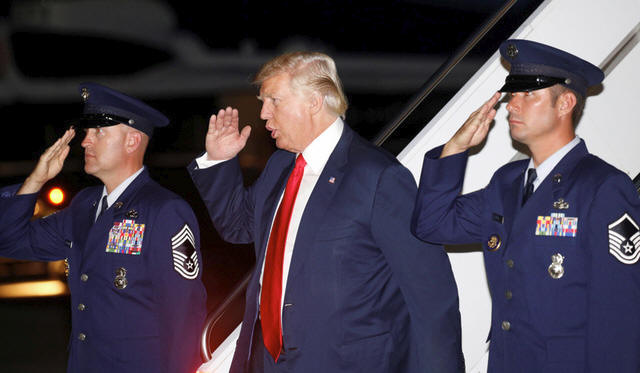 President Donald Trump salutes as he steps from Air Force One at