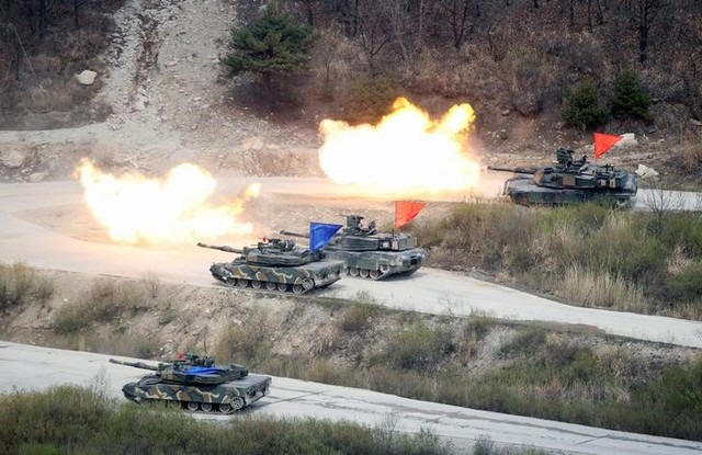 South Korean Army K1A1 and U.S. Army M1A2 tanks fire live rounds