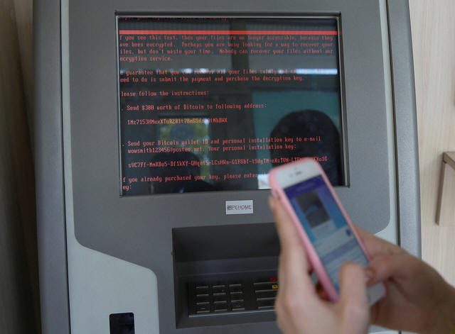 A message demanding money is seen on a monitor of a payment terminal